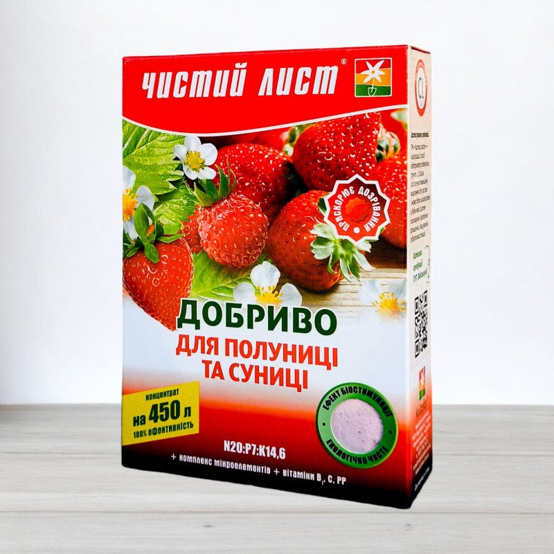 Кристалічне добриво Чистий Лист для полуниці та суниці — це високоефективний мінеральний комплекс, спеціально розроблений для забезпечення рослин усіма необхідними елементами у формі, що легко засвоюється. Завдяки концентрованій формулі одне відро добрива дозволяє приготувати до 450 літрів готового розчину, що забезпечує економічне та зручне застосування.
