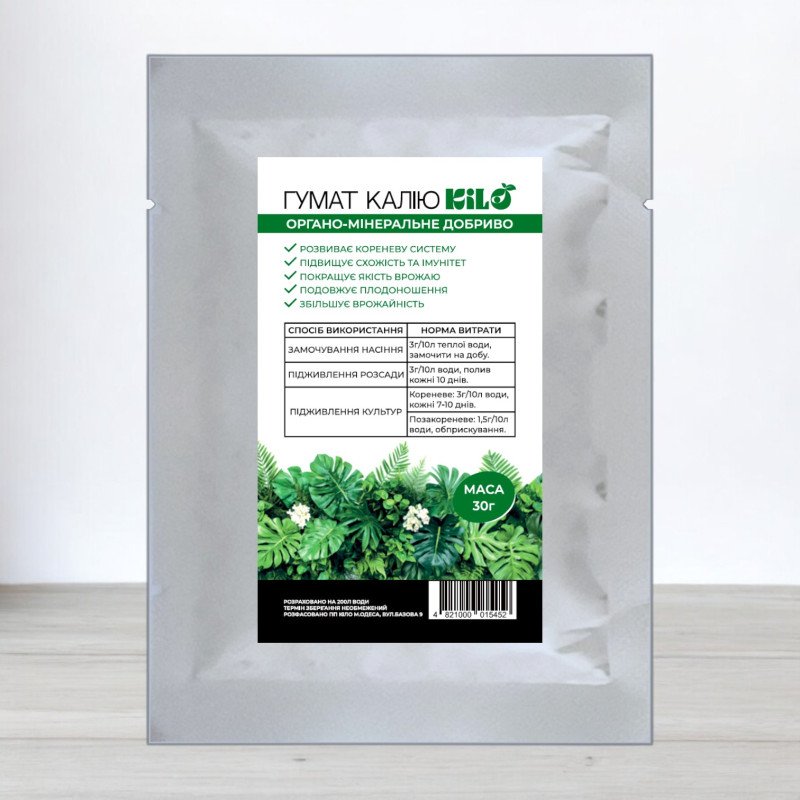 Гумат калію - потужний стимулятор росту, що містить понад 80% гумінових кислот. Ці речовини сприяють поліпшенню структури ґрунту, зниженню його кислотності та активізації обмінних процесів. Добриво позитивно впливає на вміст вітамінів у рослинах та прискорює розвиток корисної мікрофлори у ґрунті, що сприяє підвищенню врожайності.