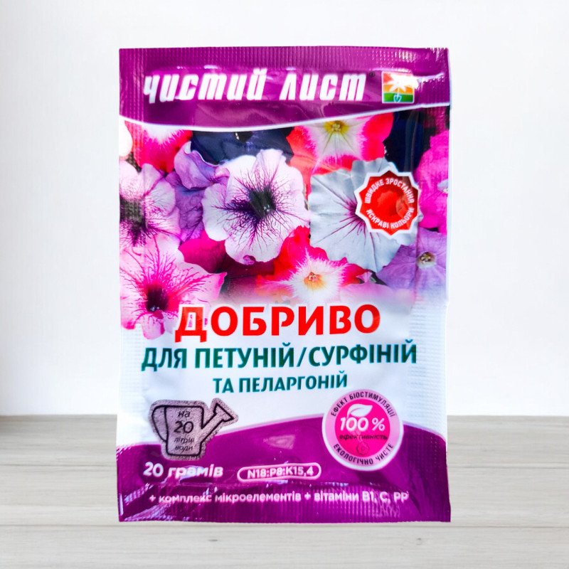 Добриво кристалічне Чистий Лист, 20г, для петуній та пеларгоній (Добрива кристалічні Чистий Лист)
