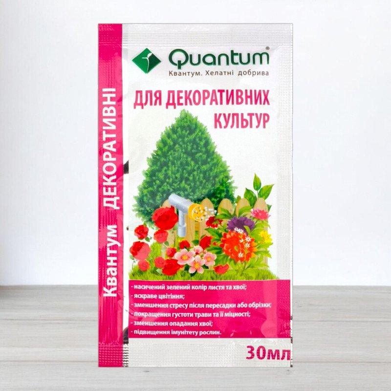 Добриво Quantum, 30 мл, для декоративних культур - це ідеальний вибір для садівників і любителів рослин, які прагнуть створити красивий і здоровий зелений куточок. Завдяки збалансованому складу, добриво сприяє їхньому активному зростанню, насиченому цвітінню та відмінному зовнішньому. виду.