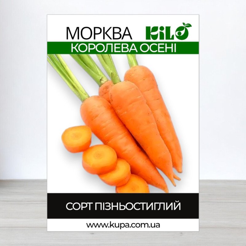 Морква Королева Осені - один з найпопулярніших пізньостиглих сортів, що ідеально підходить для тривалого зберігання та переробки. Вегетаційний період становить 120-140 днів, що дозволяє збирати врожай у пізніші терміни та отримувати коренеплоди високої якості.
