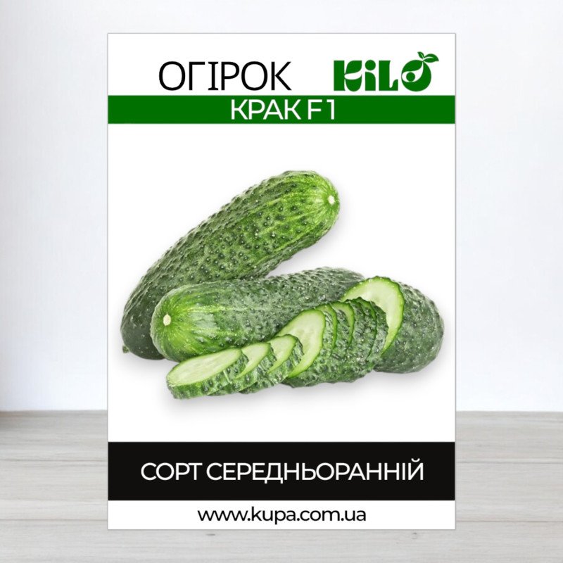 Насіння огірка Крак F1 - це середньостиглий бджолозапильний гібрид, який починає плодоносити через 50-60 днів після появи сходів. Цей гібрид виділяється переважанням жіночих квіток, що забезпечує високу врожайність та стабільне плодоношення. Плоди мають правильну циліндричну форму, насичено-зелений колір зі світлими смугами, що досягають 3/4 довжини плода. Маса одного огірка складає 80-100 г.