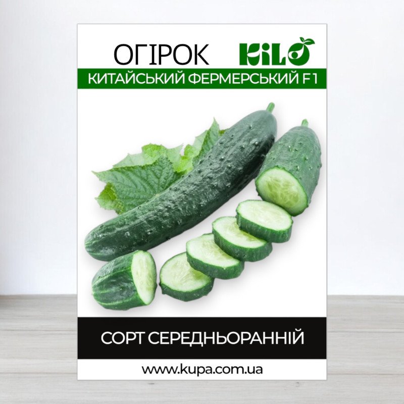 Насіння огірка "Китайський Фермерський F1" - це середньоранній гібрид, що дозріває за 50-55 днів. Цей гібрид цінується за свою холодостійкість, тіневитривалість і стійкість до таких захворювань, як борошниста роса, хибна борошниста роса і фузаріозне в'янення. Рослина потужна і швидкозростаюча, з визначною здатністю до відновлення врожаю після першого збору.