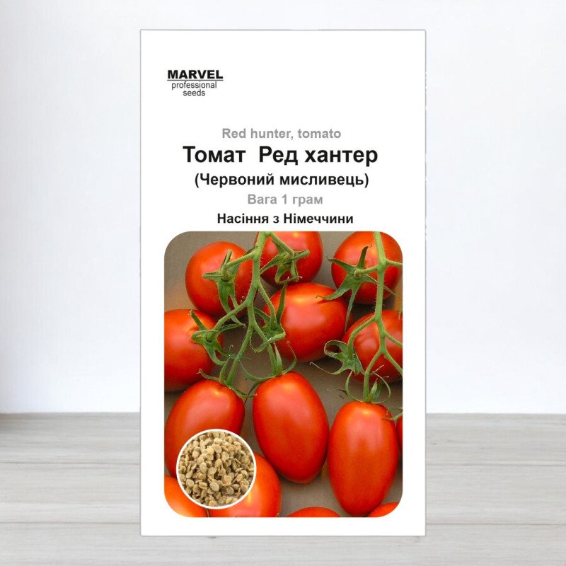 Томат Ред Хантер - дуже ранній сорт з вегетаційним періодом 85-90 днів. Його плоди мають сливоподібну форму, щільну м'якоть і вагу 90-100 г. Вони відрізняються чудовим смаком та ідеально підходять для переробки на томатну пасту та консервування. Рослини цього сорту компактні та низькорослі, що робить їх зручними для розміщення в обмежених просторах. Сорт не вимагає пасинкування, що полегшує догляд за рослинами.