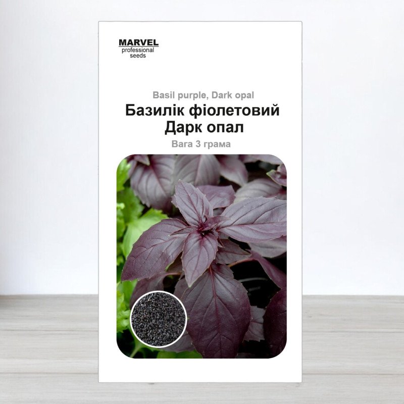 Придбайте насіння базиліка «Дарк Опал Фіолетовий» від компанії Marvel, виготовлене в Україні. Цей сорт базиліка привертає увагу своїм насиченим фіолетовим забарвленням та багатим ароматом, який перевершує аромат зелених видів.