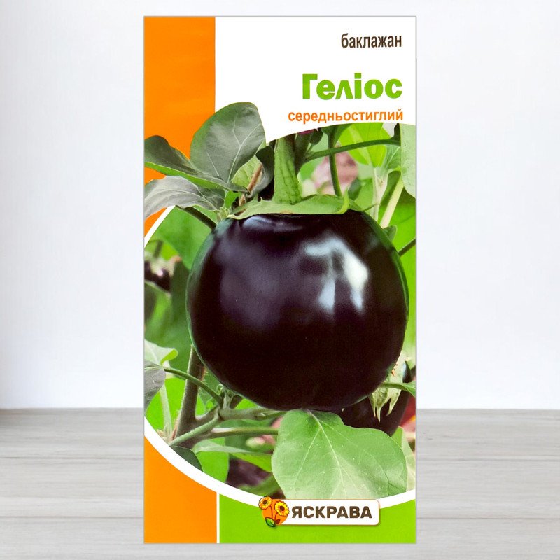 Цінність для здоров'я та кулінарії: Плоди баклажану «Геліос» округлої форми, темно-фіолетового забарвлення. Вони широко використовуються у кулінарії завдяки своєму гармонійному співвідношенню вуглеводів, білків, мінеральних солей та ферментів, які легко засвоюються організмом. Середня врожайність становить 4,5-5,5 кг/м², що робить його дуже продуктивним. ТМ Яскрава гарантує високу якість насіння.