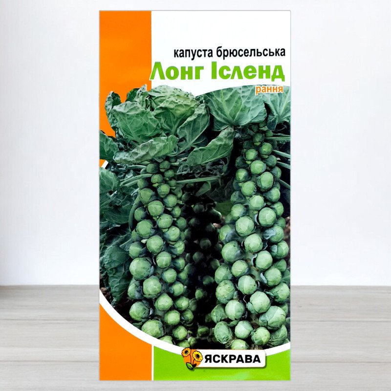 Насіння капусти брюссельської «Лонг Ісленд» ТМ Яскрава — ранній сорт, що формує до 70 кочанчиків на рослині, вирізняється високим вмістом корисних речовин, ідеальний для свіжого споживання, консервації та заморожування.