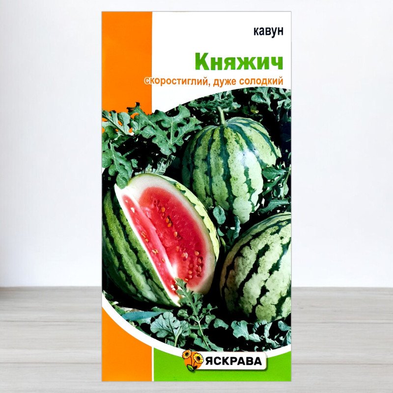 Характеристики плода та стійкість: Плоди «Княжича» мають привабливу опукло-овальну форму, гладку ясно-зелену шкірку з широкими темно-зеленими смугами та середню товщину кори (10-12 мм). М'якоть кавуна вирізняється яскравим малиновим кольором, надзвичайною соковитістю та підвищеним вмістом цукрів, що забезпечує неперевершений смак. Середня маса плодів становить 5,5-6 кг. Сорт має гарну транспортабельність та високу стійкість до поширених хвороб, таких як антракноз, бактеріоз та альтернаріоз, що значно полегшує його вирощування. ТМ Яскрава підтверджує високу якість цього насіння.