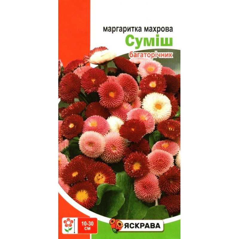 Додайте яскраві акценти та чарівність у ваш сад за допомогою насіння маргаритки махрової "Сумішка" від ТМ Яскрава. Цей дворічний сорт порадує вас різноманітністю відтінків та витонченістю своїх суцвіть. Маргаритки в цьому асорті радуватимуть вас білими, рожевими, карміновими та бордовими квітками, а жовті серединки додадуть композиціям сонячний настрій.