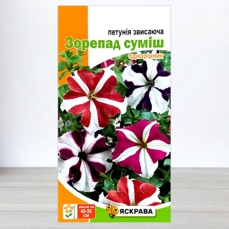 Перетворіть ваш простір на квітучий водоспад за допомогою насіння петунії, що звисає Зорепад Суміш від ТМ Яскрава. Ця унікальна суміш включає петунії з двоколірним забарвленням, де білий колір прекрасно гармонує з відтінками червоного, синього, бузкового і рожевого. Ідеально підходить для прикраси балконів, підвіконь та високих вазонів, створюючи ефектні каскадні композиції.