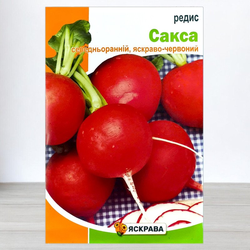 Редиска "Сакса" характеризується рівномірним розміром коренеплодів та відмінним товарним виглядом. М'якуш плодів щільний і солодкий, що робить їх відмінним вибором для вживання у свіжому вигляді. Посів насіння рекомендується починати в середині квітня, на глибину до 2 см, з відстанню між насінням до 3 см і між рядами - 15 см. При середній температурі близько +20 ° C і достатньому освітленні плоди виростають рівномірно і мають відмінний смак.