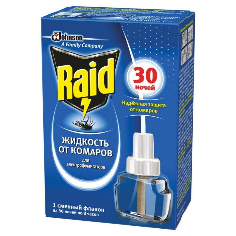 Рідина для фумігатора Raid 30 ночей – це надійний та ефективний засіб для захисту від комарів та інших комах, що літають, у приміщенні. . З Raid 30 ночей ви зможете насолоджуватися спокійним сном і відпочинком, не відволікаючись на настирливих комах.