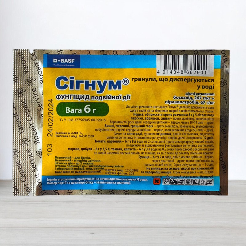 Фунгіцид Сигнум в упаковці 6 г є високоефективним засобом для захисту рослин від широкого спектру грибкових захворювань. Цей продукт відрізняється унікальною комбінованою дією, забезпечуючи надійну профілактику та боротьбу із хворобами, які завдають шкоди сільськогосподарським культурам та декоративним рослинам.