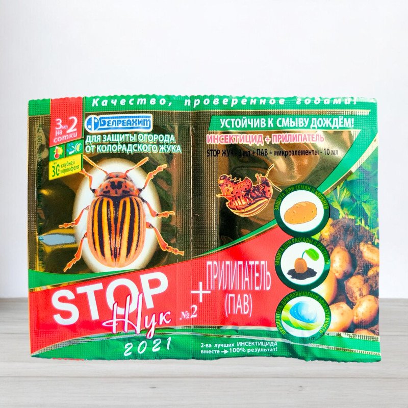 Інсектицид Stopжук у поєднанні з прилипачем - ідеальне рішення для захисту вашого врожаю від колорадського жука та інших шкідників, забезпечуючи надійний захист та високу ефективність.