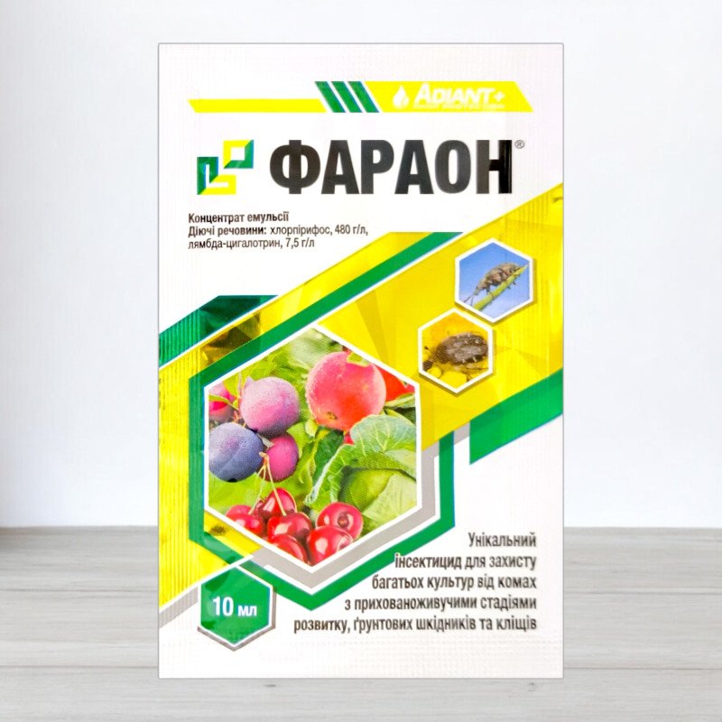 Фараон — комбінований інсектицид широкого спектра на основі хлорпірифосу та лямбда-цигалотрину із потрійним типом дії: контактною, кишковою та фумігаційною. Завдяки випаровуванню хлорпірифос проникає у важкодоступні місця — тріщини стебел, нижню сторону листя, знищуючи навіть приховано живучих шкідників. Піретроїдна складова забезпечує миттєвий нокдаун-ефект і припинення харчування шкідника одразу після обробки.