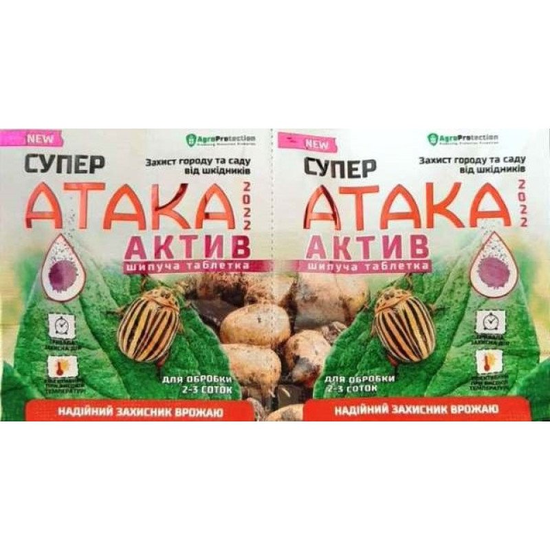 Забезпечте надійний захист рослин з інсектицидом Супер Атака Актив. Ця шипуча таблетка вагою 8 г призначена для ефективної боротьби з жуком колорадським, забезпечуючи швидку і потужну дію проти шкідників.
